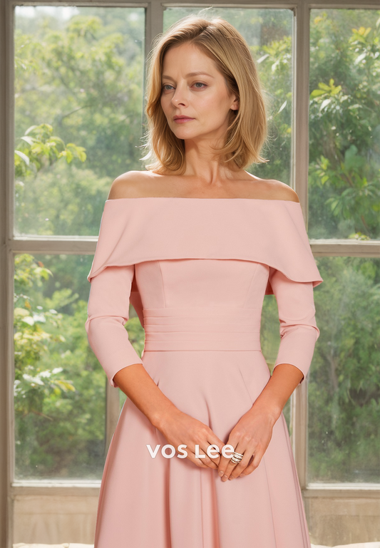 Charming A-Line Off Shoulder Long Sleeves Ruched Satin Mother of the Bride Dress