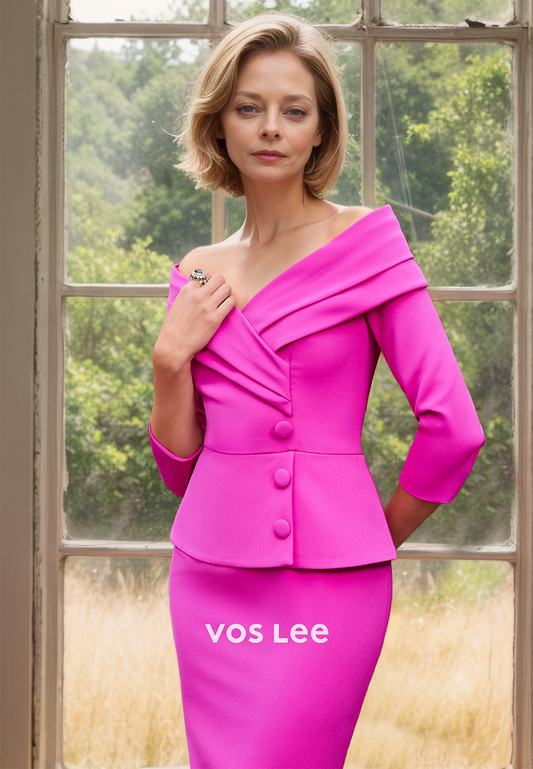 Pink Column Off Shoulder Floral Embossed Pleated Satin Mother of the Formal Dress