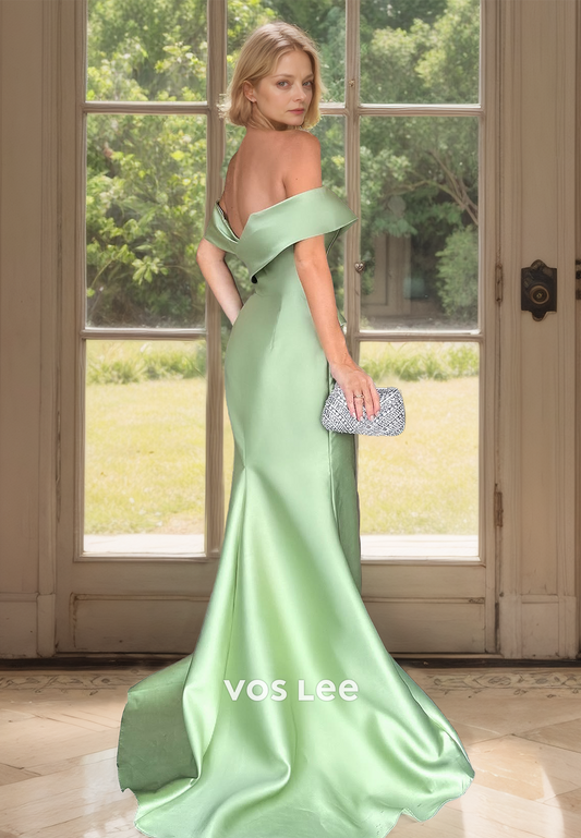 Mint Green Off Shoulder Mermaid Ruffled Sweep Train Satin Mother of the Formal Dress