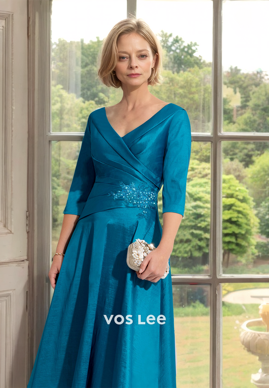 A-Line V Neck Half Sleeves Pleated Lace Appliques Mother of the Bride Dress