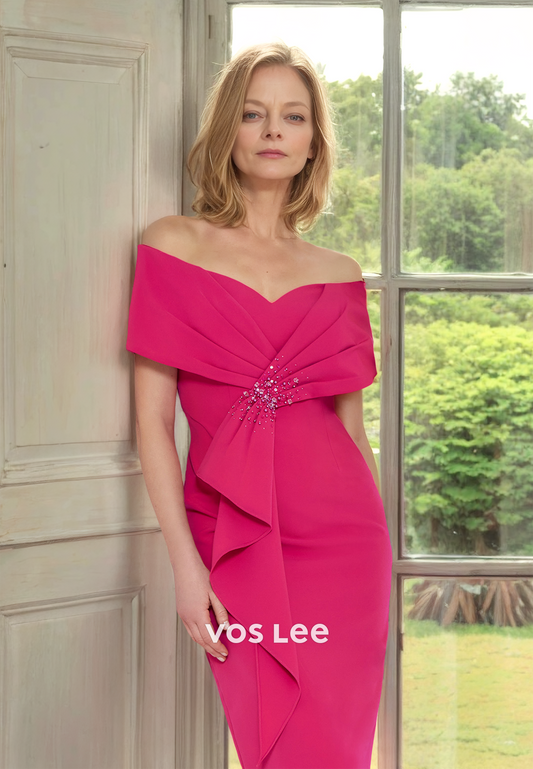 Simple Column Off Shoulder Tea Length Ruffled Sequins Mother of the Bride Dress