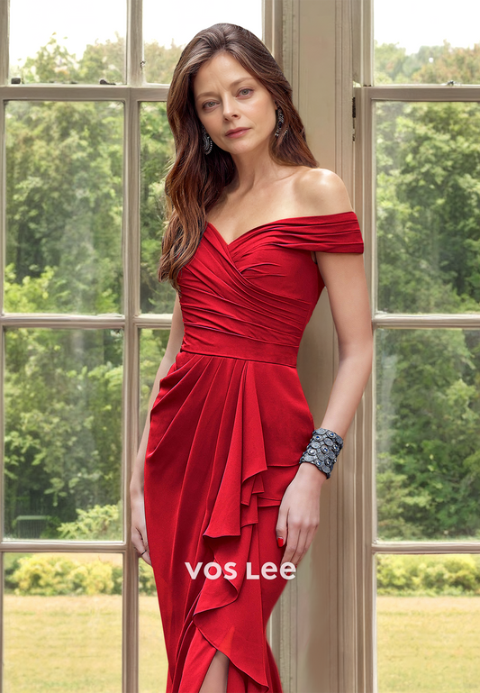 Charming Column Off Shoulder Sweep Train Side Split Mother of the Bride Dress