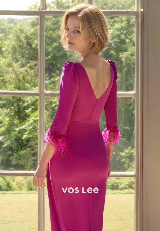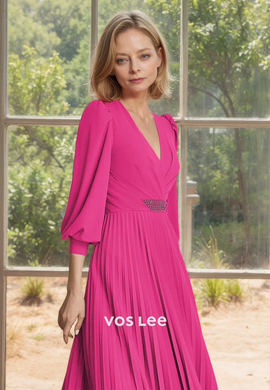 Fuchsia V Neck A-Line Tea Length Long Sleeves Pleated Mother of the Bride Dress
