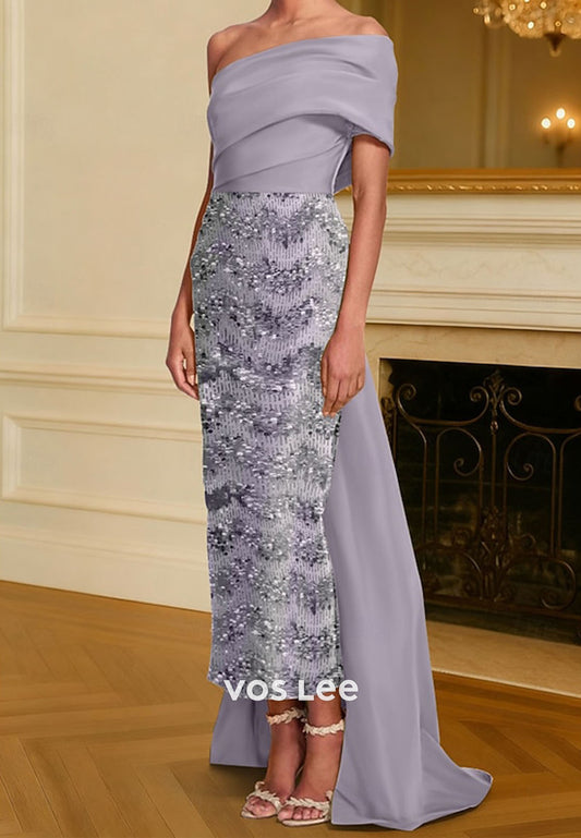 Elegant Off Shoulder Satin Sheath Evening Gown Glittering Sequined Floor Length Formal Dress