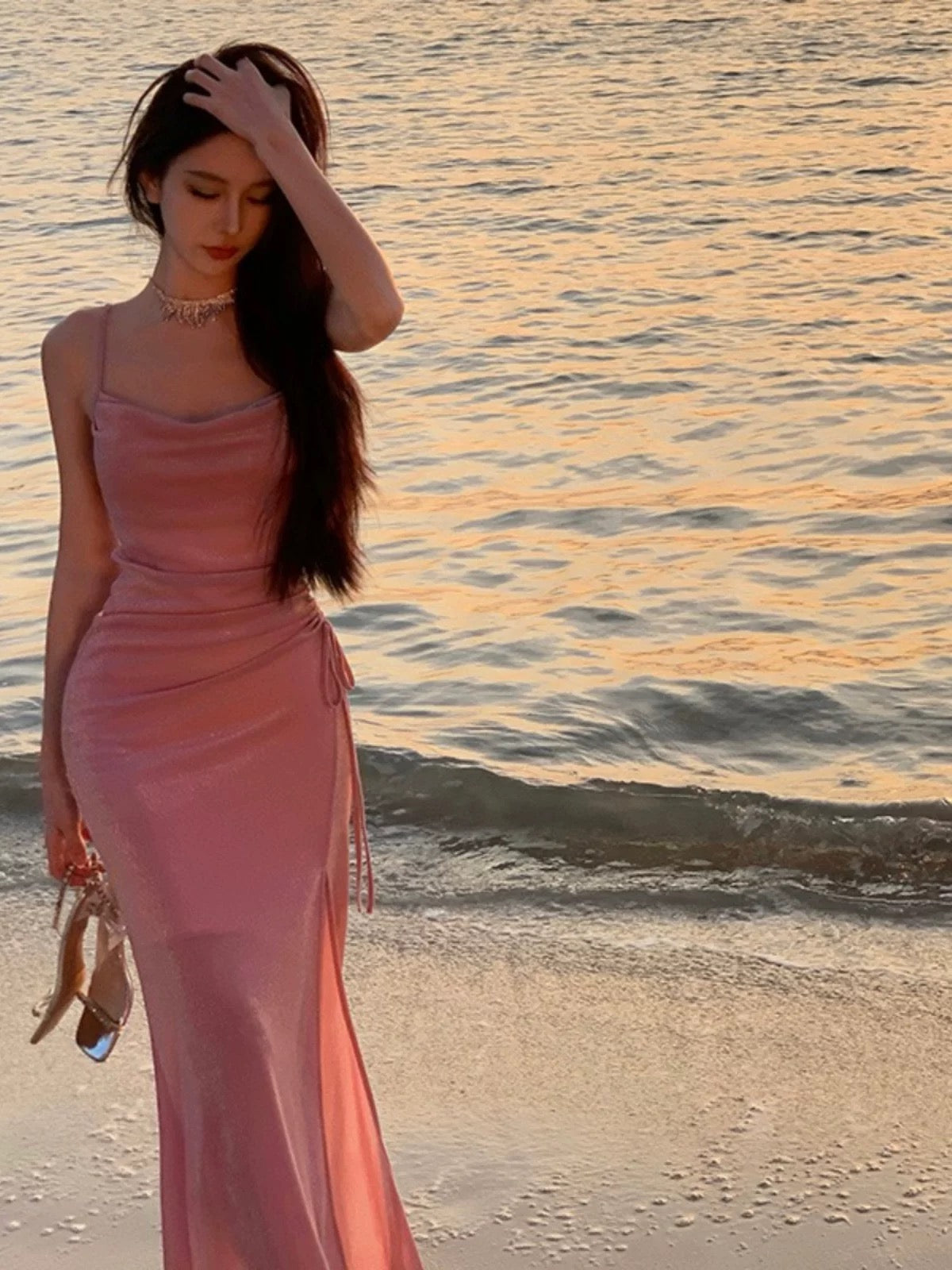 Elevate your evening elegance with this sophisticated mermaid silhouette dress. Crafted with shimmering pink sequins that catch the light beautifully, the design features delicate spaghetti straps and a modest high slit for graceful movement. The fitted bodice flows into a dramatic fishtail hem, creating a timeless, glamorous look perfect for formal events, galas, and special occasions. The sequin detailing adds dimension and sparkle while maintaining refined sophistication. An ideal choice for those seeking a balance of modesty and show-stopping style.