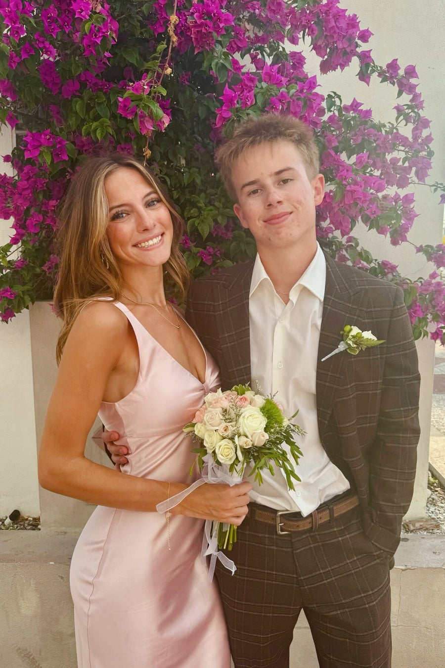 Pink satin prom dress featuring a flattering V-neck, adjustable straps, and gathered bust with cutout detail. The body-conscious silhouette flows elegantly to the floor, while the low back and invisible side zip create a sophisticated, seamless look.
