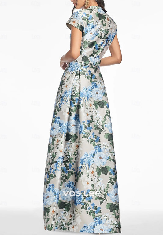 Elegant Floral Print Vintage Short Sleeve A-Line Floor Length Evening Gown Formal Dress