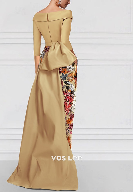3/4 Length Sleeve Satin with Bow Trumpet Floor Length Evening Gown
