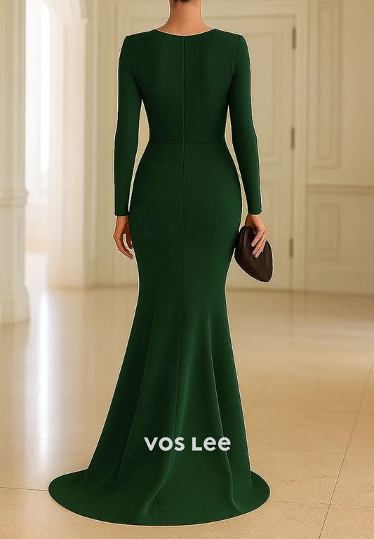 Long Sleeve V Neck Wedding Formal Mermaid Floor Length Evening Gown