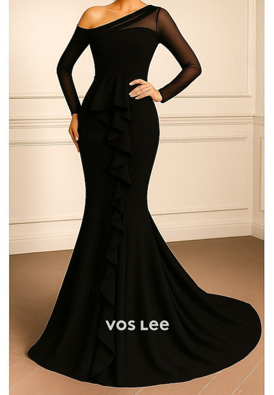 Sheer Long Sleeves One-Shoulder Mermaid Ruffles Evening Dress