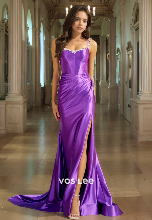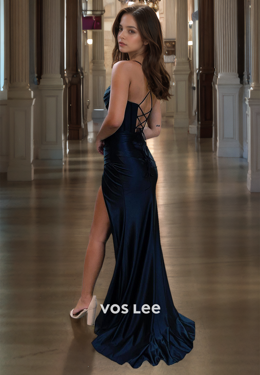 Classy Spaghetti Straps Pageant Dress Corset Back Satin Evening Prom Gown with Slit
