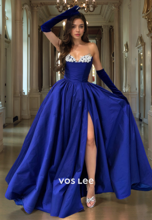 A-Line Satin Royal Blue Evening Prom Gown Sweetheart Strapless Long Dress with Free Gloves