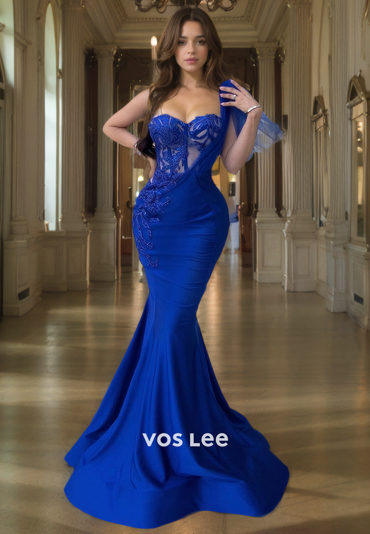 Luxury Royal Blue Sweetheart Evening Party Gown One Shoulder Satin Mermaid Prom Dress with Detached Train