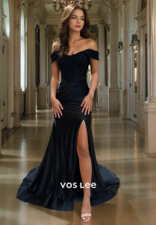 Royal Blue Satin Mermaid Quinceanera Dress Off-Shoulder Zipper Back Party Gown with High Slit
