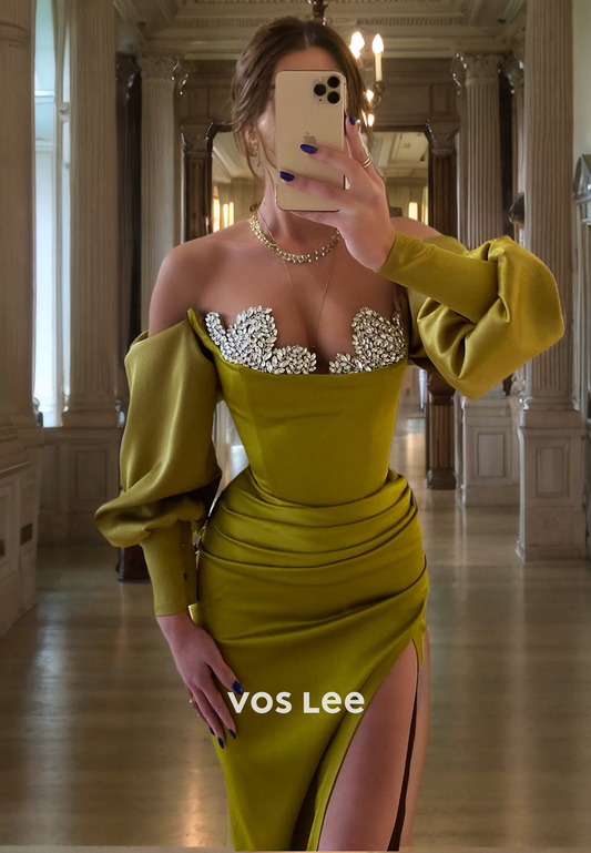 Elegant Sweetheart Satin Prom Dress with Long Sleeves High Slit Beads Luxury Long Dresses