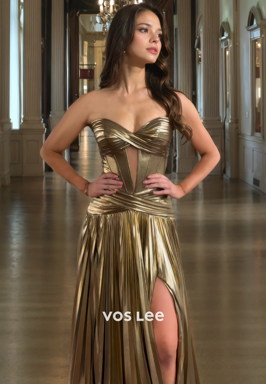 Luxurious Sweetheart Gold Strapless Prom Dress with Slit Pleated Sleeveless Formal Cocktail Dresses