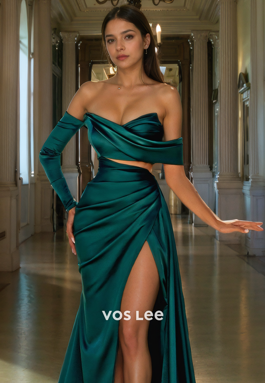Sweetheart Green Off-Shoulder Elegant Prom Dress Pleated Long Party dress with Slit