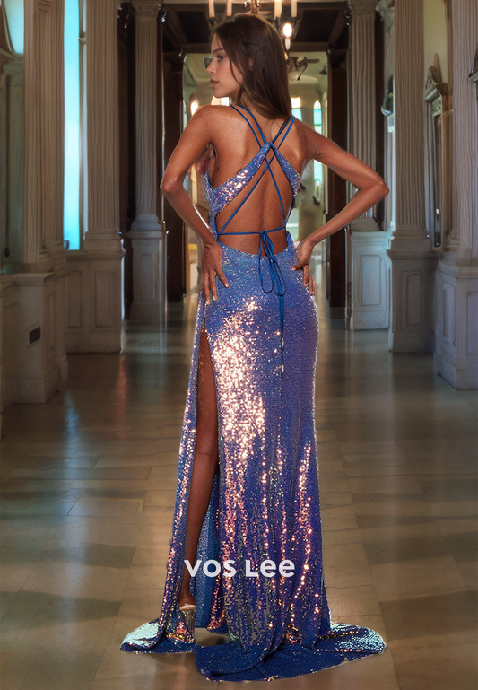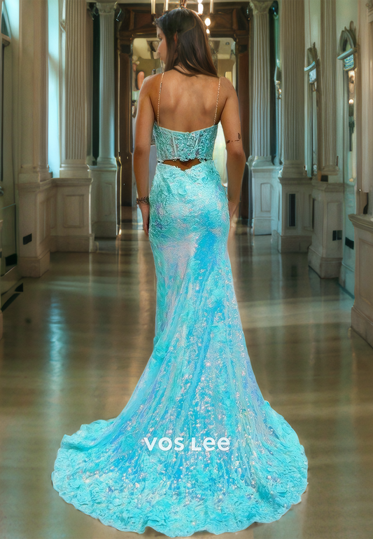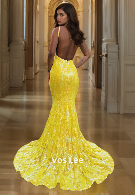 Sparkly V-Neck Spaghetti Straps Formal Prom Dresses Mermaid Luxury Evening Dress