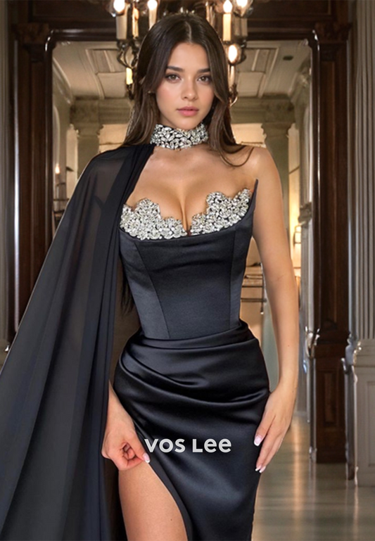 Elegant Satin Beads Sleeveless Prom Dress for Women Strapless Zipper Back Party Dress with Slit