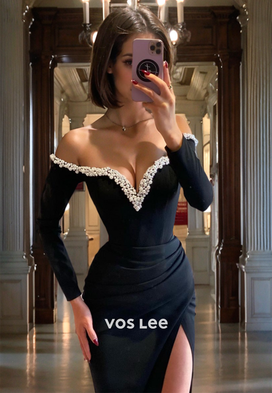Sexy V Neck Pageant Dress with Long Sleeves High Slit Beads Zipper Back Club Night Party Dress