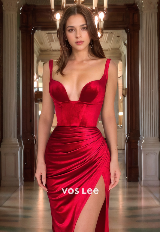 Elegant Mermaid Velour Sweetheart Prom Evening Dress Spaghetti Straps Pleated Formal Gown