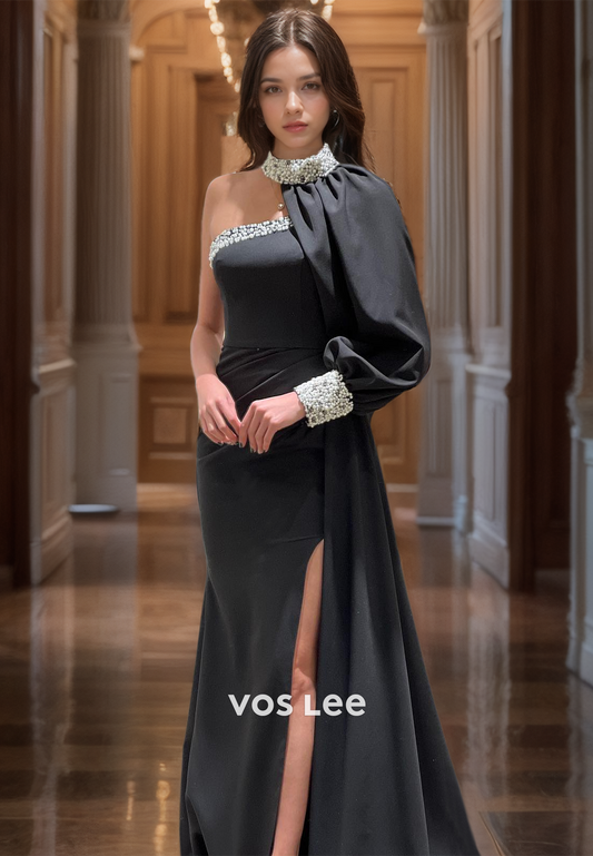 Elegant High Neck Pearls Evening Prom Gown One Shoulder Mermaid Quinceanera Dress