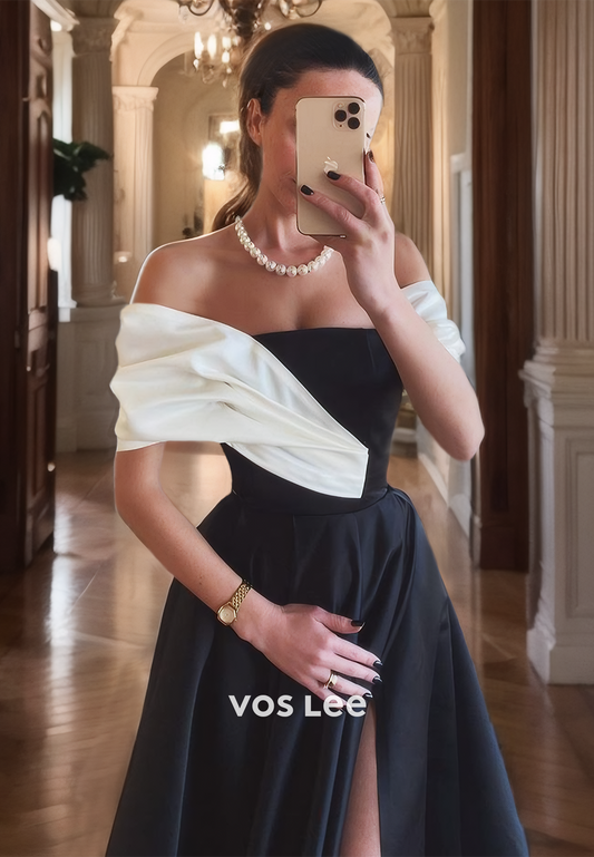 Elegant A-Line Off-Shoulder Long Prom Dress Satin Sleeveless Party Dresses with High Slit