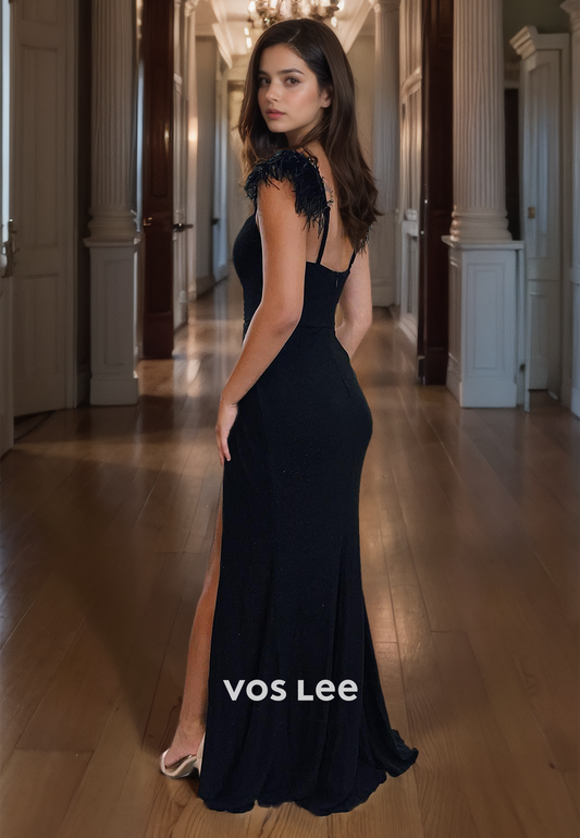 Elegant Black Feathers V-Neck Cocktail Party Dress Straps Night Party Dress with Slit