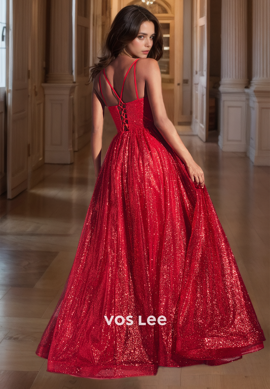 Sparkly A-Line Glitter Prom Gown Lace Up Straps Evening Party Dresses