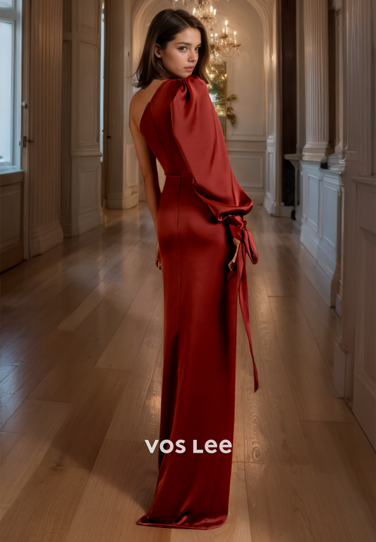Burgundy Satin A-Line Luxury Prom Dress One Shoulder Side Slit Evening Party Dresses