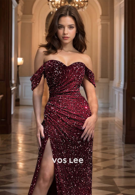 Burgundy Off-Shoulder Sweetheart Quinceanera Dress Sparkly Sequined Long Dresses
