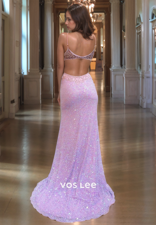Elegant Lilac V-Neck Mermaid Prom Dress Spaghetti Straps Beads Backless Evening Party Dress