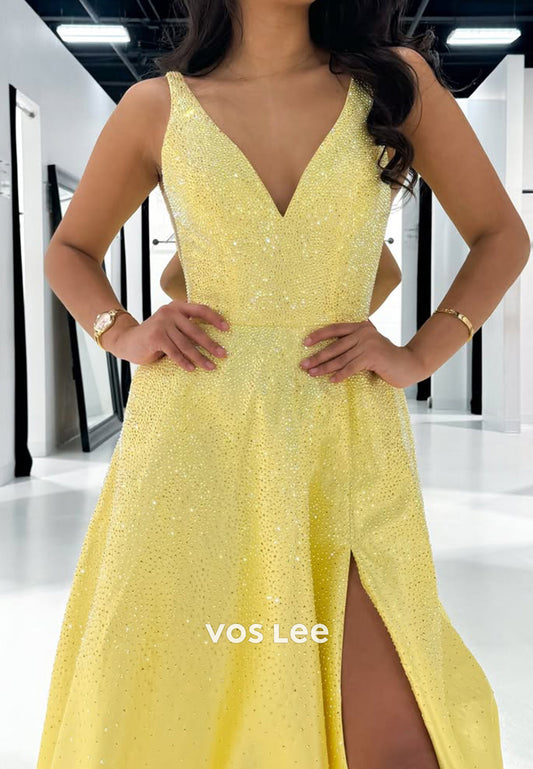 Yellow Simple Straps V-Neck A-Line with Slit Satin Evening Dress Prom Gown