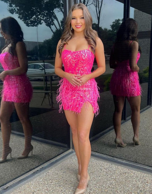 Fuchsia Bodycon Spaghetti Straps Party Dress With Feather