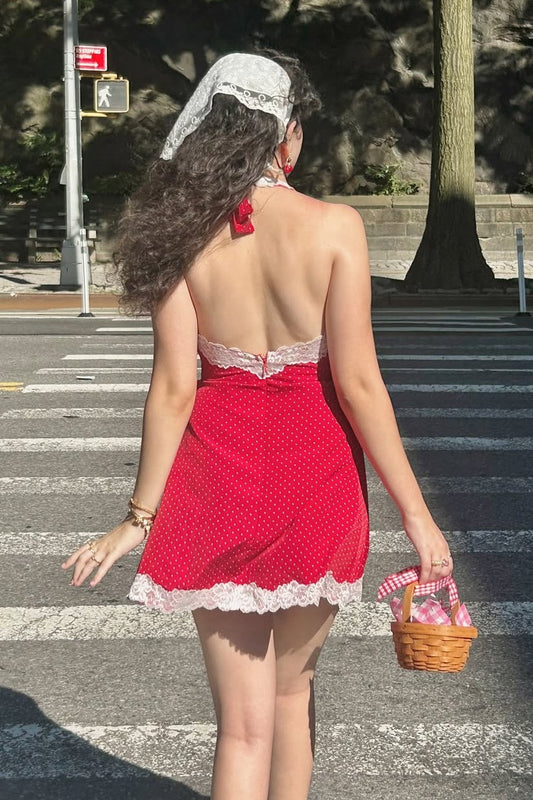 Cute A Line Halter Neck Red Polka Dots Short Homecoming Dress with Lace