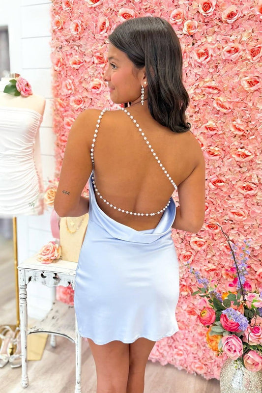 Trendy Sheath Halter Neck Light Blue Short Homecoming Dress with Backless