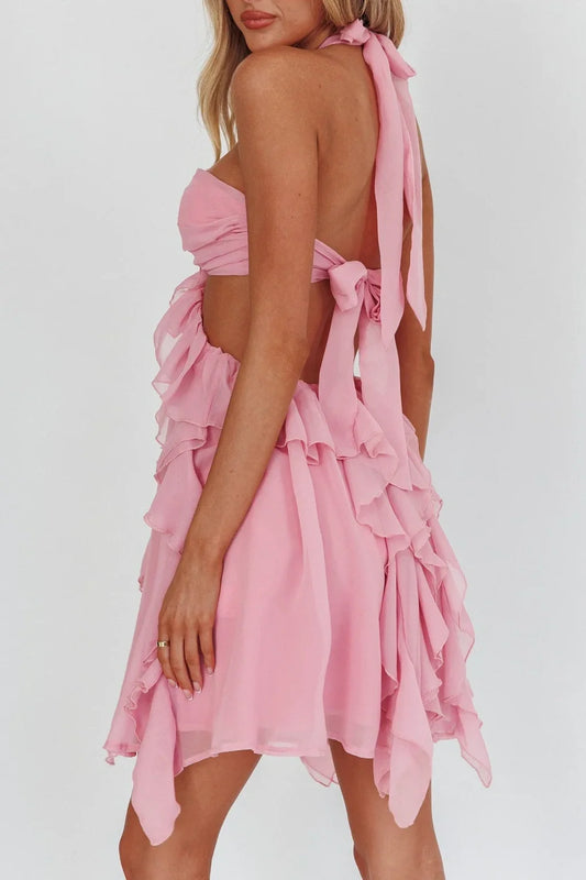 Gorgeous A Line Halter Neck Pink Short Homecoming Dress with Ruffles