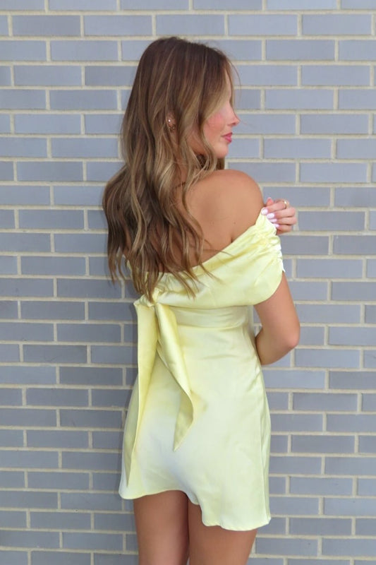 Simple A Line Off the Shoulder Light Yellow Short Homecoming Dress