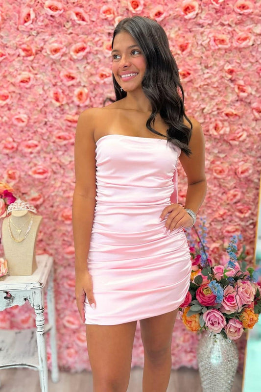 Trendy Sheath Strapless Pink Short Homecoming Dress with Bowknot Back