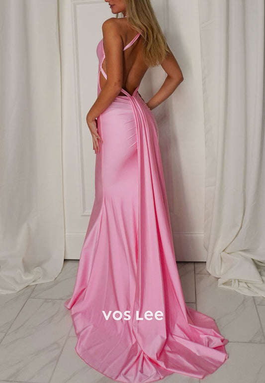 Sexy Pink Halter V-Neck Satin Backless Mermaid Prom Dress
