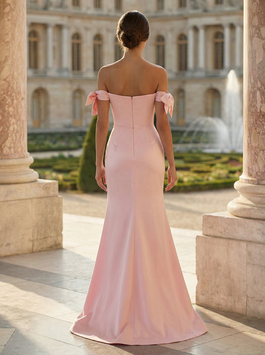 Blush Pink Strapless Satin Prom Dress | Bow Detail Mermaid Gown with High Slit