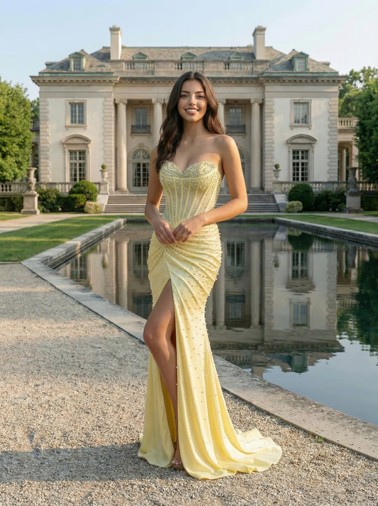 Sweetheart Strapless Yellow Ruched Back Tie Long Dress with Slit