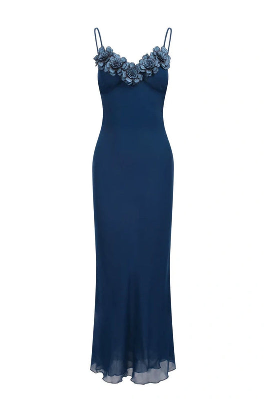 Chic Sheath Spaghetti Straps Navy Blue Long Party Dress with Flowers
