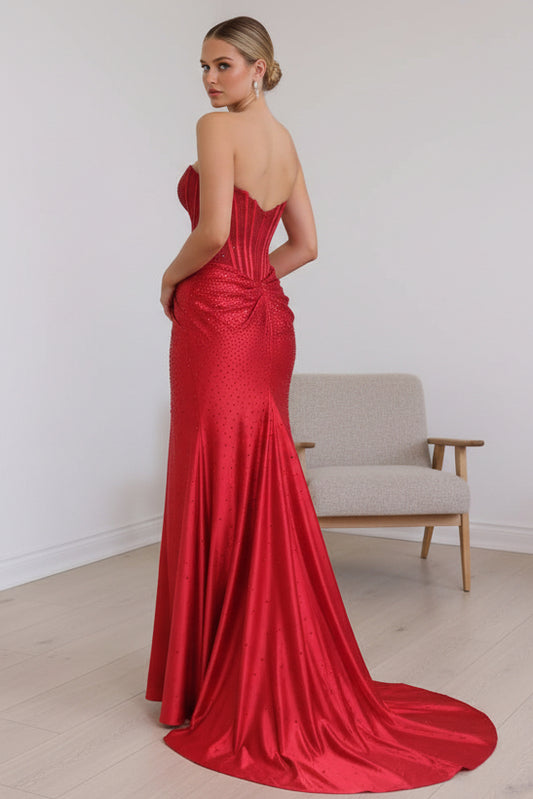 Sweetheart Strapless Mermaid Satin Beaded Long Formal Prom Dresses With Slit