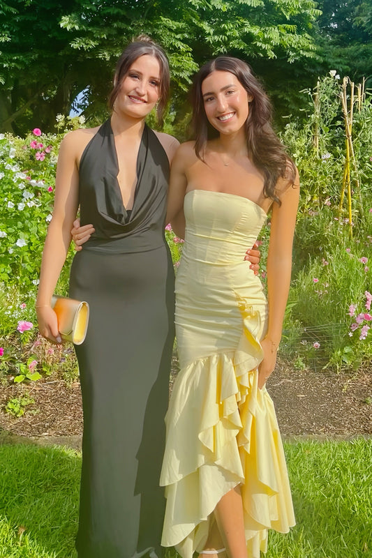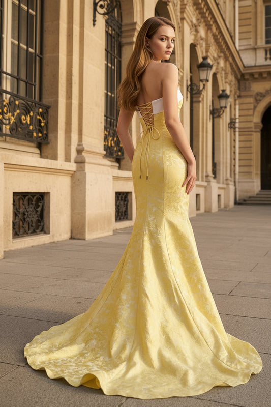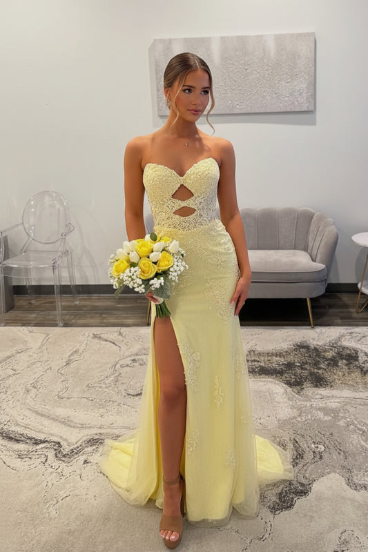 Yellow Strapless Mermaid Satin Formal Prom Dresses With Cutout