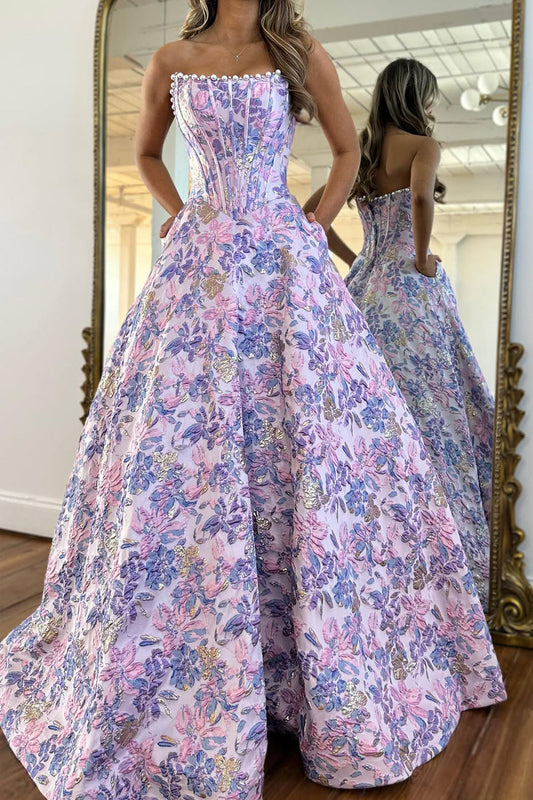Yellow Pink Flowers A-Line Strapless Corset Backless Long Prom Dress with Slit