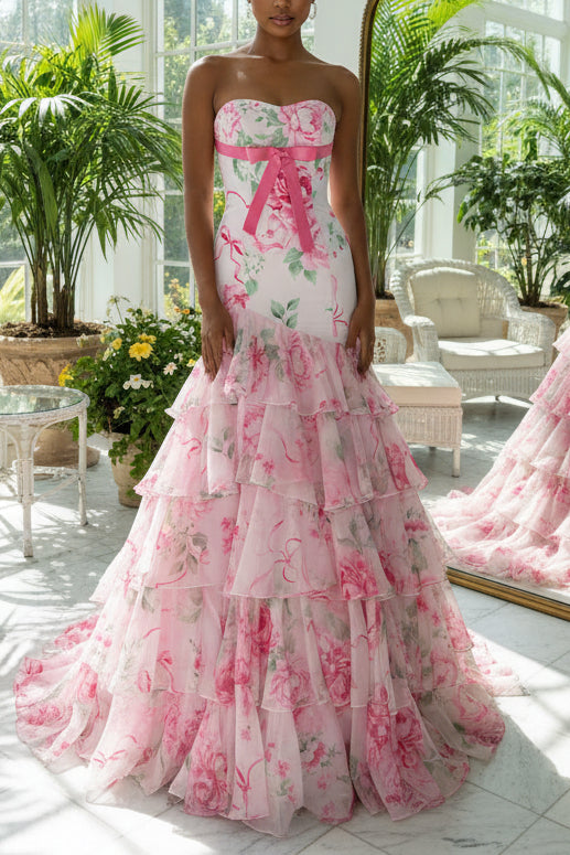 Mermaid Strapless Pink Floral Chiffon Prom Dress