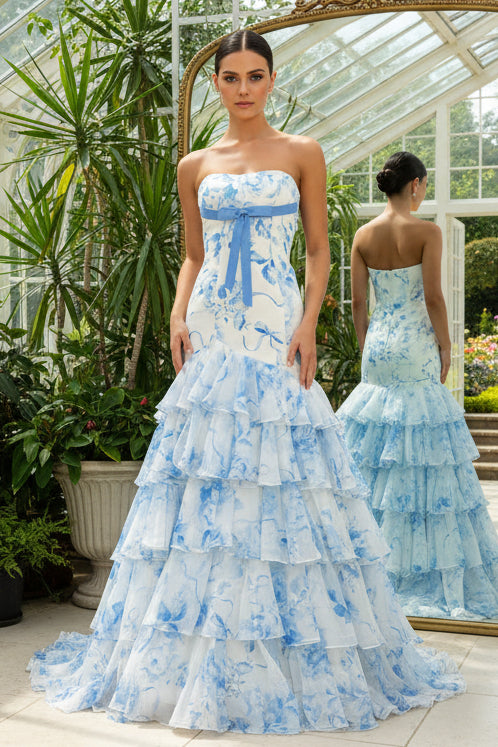 Mermaid tieres Ruffles Strapless White Blue Floral Chiffon Prom Dress