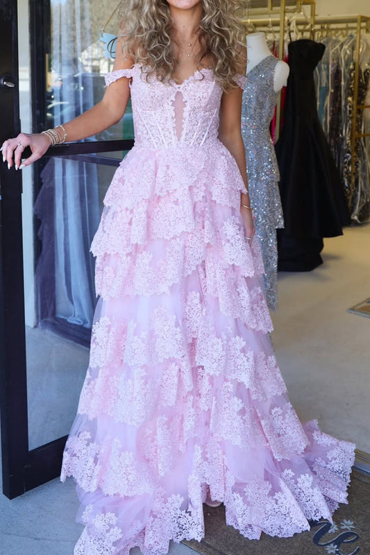 Gorgeous A Line Off the Shoulder Light Pink Tiered Tulle Prom Dress with Slit