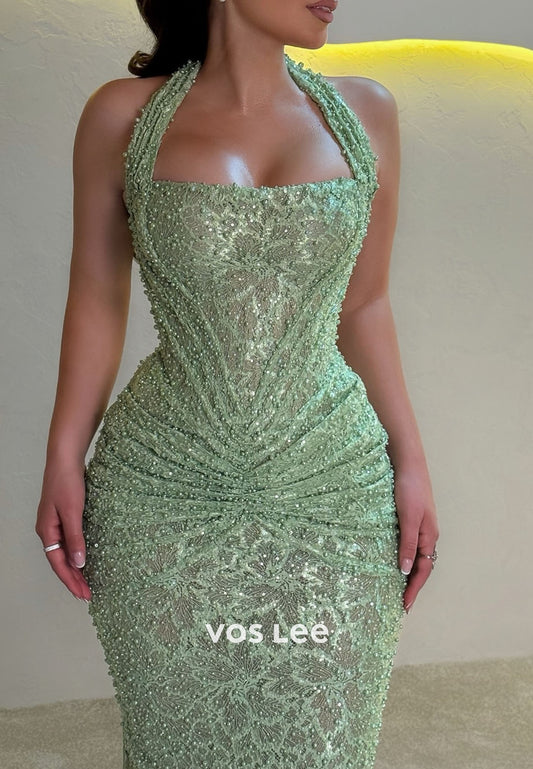 Shining Hlater Pleated Fully Pearls Evening Gowns Sleeveless Mermaid Prom Dress